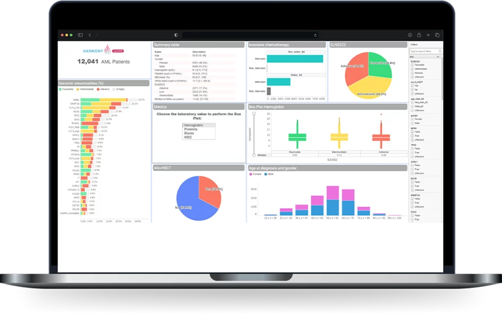 The HARMONY Platform is a secure, high-quality research ecosystem designed to accelerate data-driven innovation in haematology. It brings together over 120,000 anonymised patient records from across Europe — including clinical, genomic, molecular, and omics data from hospitals, study groups, registries, and clinical trials.