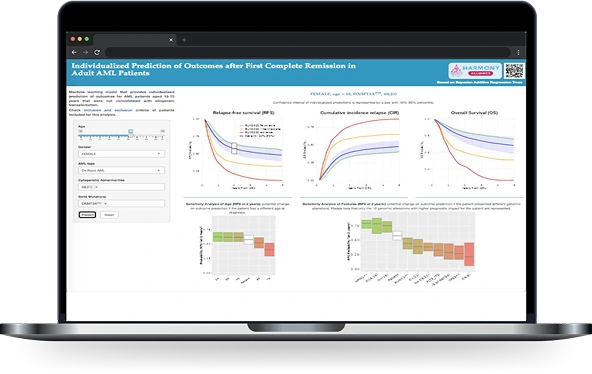It uses a machine learning model trained on real-world HARMONY data to support treatment decision-making, particularly in countries where targeted therapies are limited. Clinicians can use it to evaluate whether a patient may benefit from allogeneic transplantation.