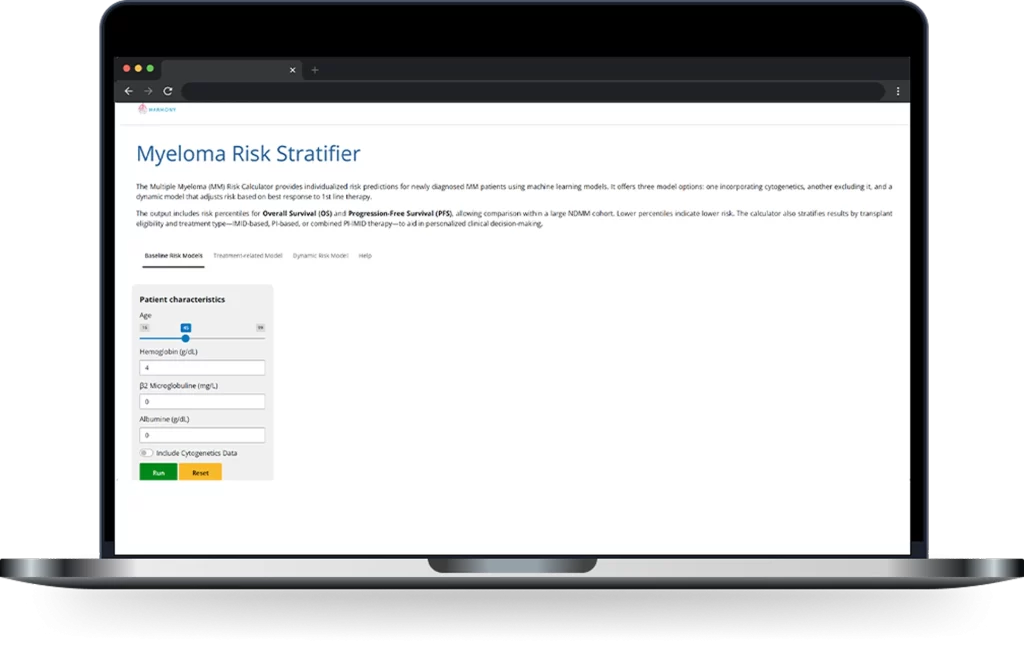 The HARMONY MM Risk Stratifier is an online tool that supports risk classification for patients with newly diagnosed multiple myeloma. It uses harmonized, anonymized real-world data from the HARMONY Big Data Platform to estimate the probability of early progression or adverse outcomes based on individual patient characteristics.